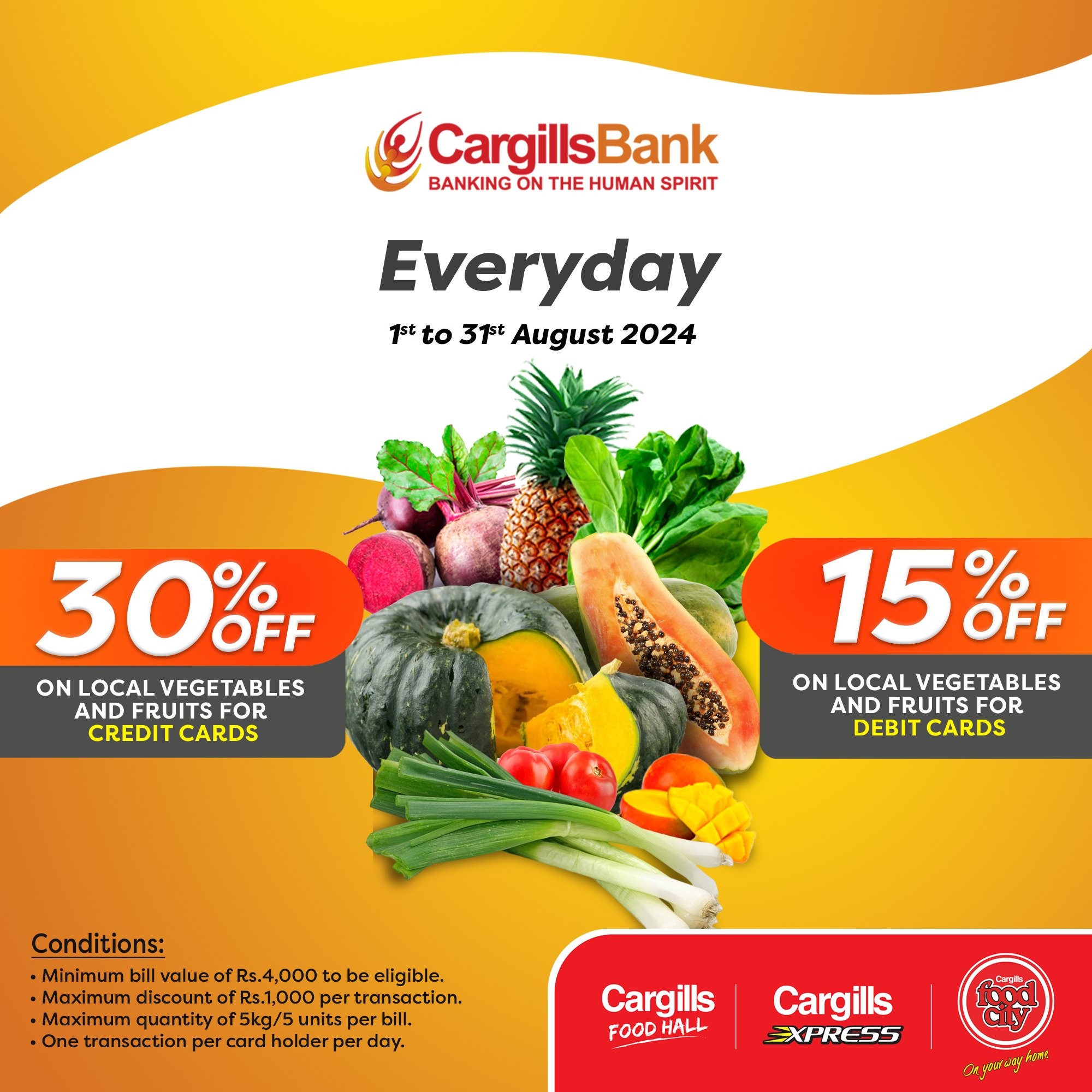 Get 30% & 15% OFF on Local Vegetables & Fruits when you shop at your nearest Cargills Food City using your Cargills Bank Credit & Debit Cards!