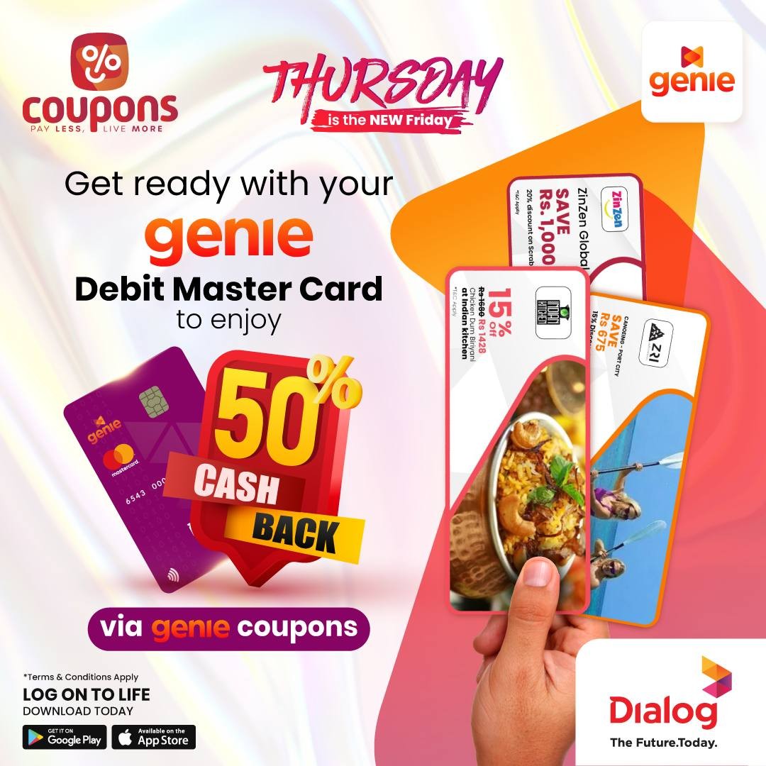 Description Coming soon!! 50% cashback ! Be ready to buy genie coupons with genie Debit Mastercard! Don't miss out, Download genie & apply your genie Debit Mastercard today! Experience an amazing one-day offer on July 11th with your genie Debit Mastercard from Dialog Finance PLC! Get 50% cashback on your first two genie Coupon purchases through the Genie App. Simply find coupons under the “genie Mastercard Promo” category and pay with your genie Debit Mastercard to enjoy this fantastic deal. This exclusive offer is available for one day only, so don’t miss out! Terms and Conditions