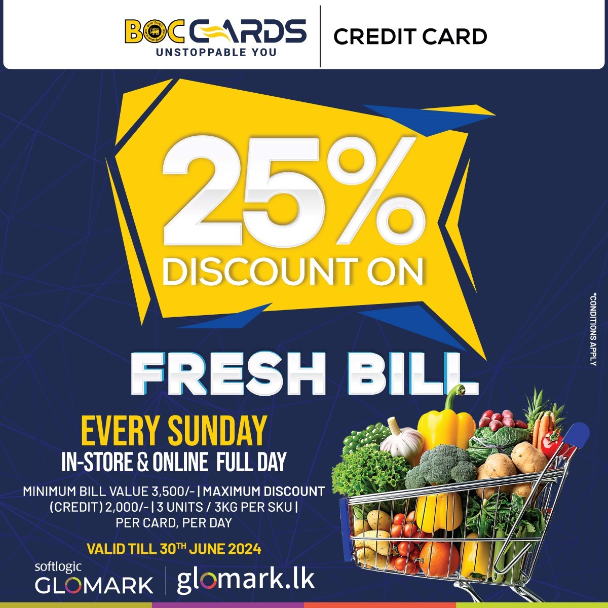 Description Enjoy 25% DISCOUNT on Fresh Vegetables, Fruits, Meat & Seafood with BOC Credit Cards, every Sunday till 30th June 2024. Valid at all GLOMARK outlets and for online transactions via www.glomark.lk. Conditions – • Minimum Total Bill Value – 3,500/- • Maximum Discount (Credit & Debit) – 2,000/- • Maximum 3 units/ 3kg per product • One Transaction Per Card, Per day • Excluding – Packed or Packeted/ Processed Vegetables, Fruits, Meat & Seafood. *Conditions apply |